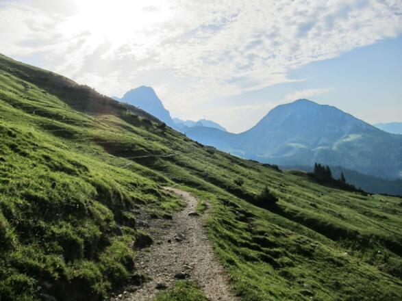 Über einen schönen Almhöhenweg geht es dann von Lungötz bergauf an den Höheneggkopf und über mehrere Käsealmen (in der Saison tw. bewirtschaftet) zu den Brandlbergköpfen (1.760 m). Anschließend erreichen wir – absteigend – die Laubichlalm und die Dr.-Heinrich-Hackel-Hütte (1.526 m, ab Anfang Mai geöffnet, kein Winterraum).