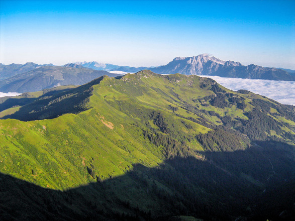 Vom Statzerhaus gehen wir ein Stück zurück, wandern in den Bereich des Ochsingers (1978 m) und gehen vorbei am Galtviehkopf (1986 m), um über den Bergkamm der Pfarrachhöhe (1922 m) in den Bereich des Lammsteinsattels (1620 m) zu gelangen. (Es ist auch möglich, auf bezeichnetem Weg in der Ostflanke des Galtviehkopfs über die Vordere Brandstättalm den Lammsteinsattel zu erreichen.) Bald darauf betreten wir den Wald, die Taxberghöhe (1678 m) bleibt links von uns liegen, und kurz darauf kommen wir zu einer Straße, die uns in langgezogenen Kehren an der „Rieser Aste“ vorbei nach Holzlehen, anschließend in die Streusiedlung Taxberg und zuletzt nach Taxenbach bringt.