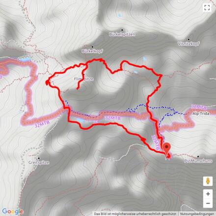 Von der Alp Trida Sattel startet die Wanderung entlang dem Grat vom Alp Trider Eck Richtung Viderjoch. Kurz unter dem Viderjoch kommt der Weg am tiefblauen Beschneiungssee vorbei. Das Viderjoch ist auf der Grenze zwischen Österreich und der Schweiz, dieser Punkt kann auch mit der Sesselbahn via Alp Trida erreicht werden. Nun geht der Weg links vom Flimspitz auf österreichischem Boden weiter. Es folgt ein kurzer Abstieg, bevor der gut signalisierte Weg über den imposanten Felssturz unterhalb des Flimspitzes führt. Der Weg führt in einem kurzen Anstieg zum Flimjoch, wo wiederum die Landesgrenze überschritten wird. Hier gibt es die Möglichkeit, einen Abstecher auf den Flimspitz zu machen. Zur linken türmen sich der Bürkelkopf und die Bürkelspitzen. Unten in der Ebene angelangt, gibt es fünf kleine Seen. Die zahlreichen grossen Felsbrocken rund um die Seen eignen sich bestens für eine Rast. In einer knappen Stunde gelangt man zurück zum Alp Trida Sattel.
