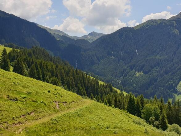 Beim "Hanslerhof" von der Gemeindestraße Oberhausenweg abzweigend durch schöne Wälder zur Hansler- und weiter zur Burgstallalm. Von dort herrlicher Ausblick auf den Sintersbach Wasserfall, die Hohen Tauern, Teufelssprung und Kuhkaser. Die Gesamtlänge dieser Route (inkl. Verbindung zur Route 212) bertägt ca. 5,5 km.
