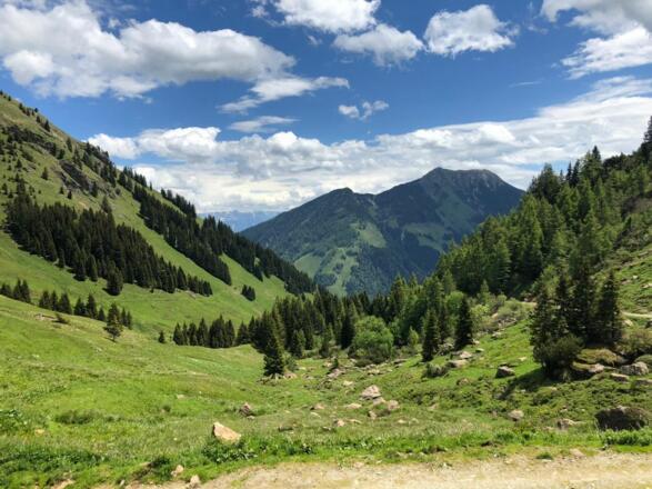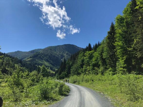 Startpunkt dieser ausgehnten, schweren Tour ist beim Infobüro in Kössen. Bis zum Kreisverkehr fahren, die erste Abzweigung nehmen und der Hüttfeldstraße bis zum Ortsteil Blaik folgen. Die Großache queren, links abbiegen und der Straße bis zur nächsten Brücke über die Großache folgen. Durch den Ortsteil Kaltenbach und danach entlang der Hauptstraße fahren. Der Beschilderung folgen bis links die Abzweigung auf den Forstweg folgt. Die Strecke verläuft nun zum Teil mäßig ansteigend durch reizvolles Waldgegiet. Sobald das erste Wiesenstück nach dem Wald erreicht ist, besteht die Möglilchkeit zur Klausenbergalm abzubiegen. Oder der Biker bewältigt die nächsten 6 km, welche durch zum Teil flach bis mäßig ansteigendes Gelände in Schlangenlinien durch den Wald bis zur Kreuzangeralm führen. Richtung Norden führt die Route dann stark ansteigend durch Almweiden noch knapp 5 km auf die Eggenalm bzw. dem Straubingerhaus.