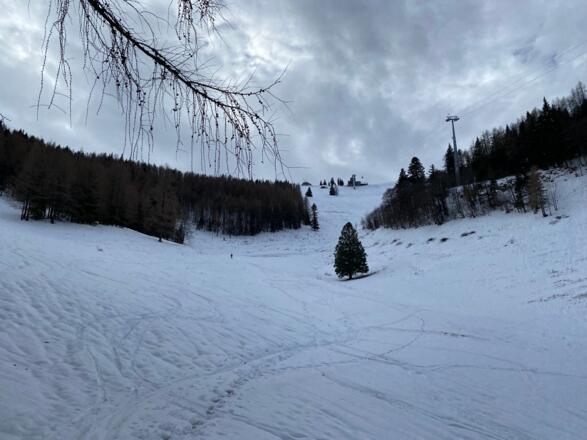 Bei eisigen Bedingungen kann die Schlepplift Trasse unter der Hütte in einem weitem Linksbogen (der Forststraße folgend) umgangen werden.