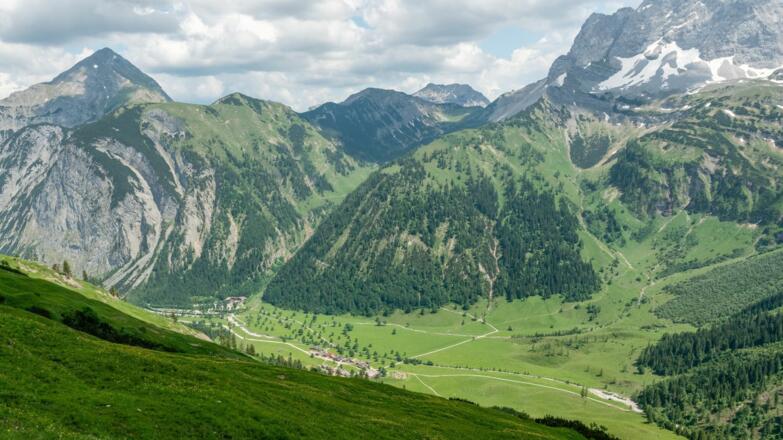 Von hier wandert man auf einem breiten Fahrweg und einige Zeit nahezu parallel zu einem tief eingeschnittenen Tal hinunter ins Almdorf der Eng (1.270 Meter) mit den vielen urigen Hütten unter uralten Ahornbäumen. Hinter den letzten Almgebäuden beginnt rechter Hand der breite Fußweg zur Falkenhütte. Er steigt sanft an und führt durch Bergwiesen und Mischwald nach oben auf das Hohljoch (1.794 Meter). Vom Joch geht es auf einem guten Steig unterhalb der Laliderer Wände wieder hinab bis auf knapp 1.700 Meter. Dabei werden die Laliderer Reisen gequert. Auf dem letzten Stück der Etappe zieht der Steig sanft nach oben zum Spielissjoch, die letzten Meter zur stattlichen Falkenhütte (1.848 Meter) spaziert man auf einem Fahrweg.