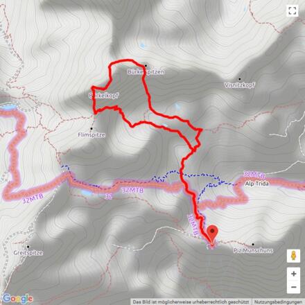 Eine alpine Route führt meist durch wegloses Gelände, über Gletscher oder Fels mit Kletterstellen. Geübte Berggänger müssen hier ihre Hände und gegebenenfalls weitere Hilfsmittel einsetzen. Von der Bergstation bis zum Flimjoch (2-Länder-Route). Dort führt die Markierung nördlich, links vom Grat durch eine Rinne. Sie umgehen einen Felsaufbau links, marschieren wieder zum Grat und dann weiter zum Gipfel. Der Bürkelkopf setzt sich aus einer geologischen Serie von Diabas, Tuffen, Serpentin und Gabbro zusammen. Hier eröffnet sich ein wunderbares Panorama. Weiter geht es Richtung Versulscharte über einen Gletscher ca. 100 m entlang zum Obernberg. Von da wandern Sie leicht ansteigend zur Bürkelscharte weiter. Dort führt Sie der ziemlich steile Weg in losem Geröll im Zick Zack hinunter zu den Seen. Anschliessend gelangen Sie wieder zum Alp Trider Sattel zurück. Wichtiger Hinweis: Für diese Route müssen Sie trittsicher und schwindelfrei sein.