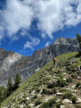 Weiter über einen Latschenhang/Rücken bis hoch zum Sprengmast (Roter Mast).