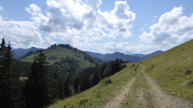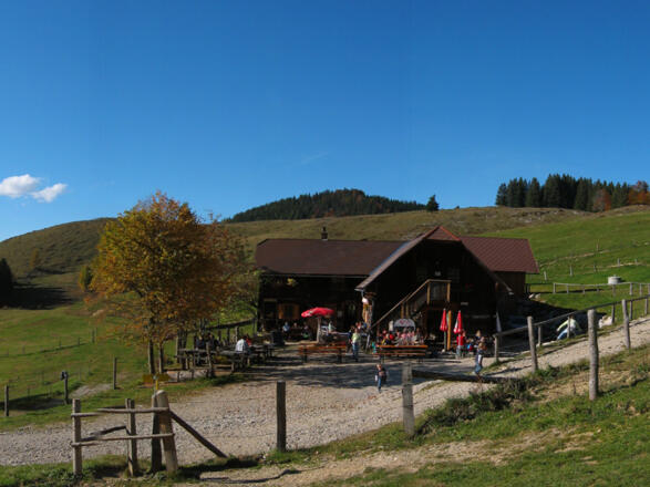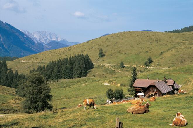 Über eine Forststraße und anschließend auf einem Waldweg zu den „3 Bildern“ führt der Weg auf auf die Anlaufalm (982 m).
