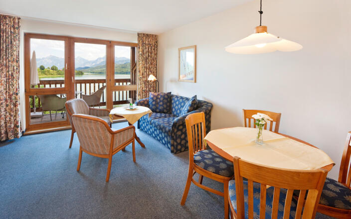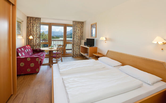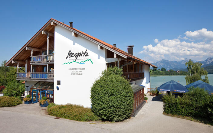 Urlaub in traumhafter Lage direkt am Weissensee!Das familiengeführte Appartementhotel SEESPITZ bietet Ihnen voll ausgestattete Ferienappartements mit wunderbarer Aussicht. Das Hallenbad (32º C Wassertemperatur) verfügt über ein separates Kinderbecken und eine großzügige Sauna. Direkt von der hoteleigenen Liegewiese haben Sie Zugang zum See. Das am Hotel anschließende Strandbad verfügt über einen weitläufigen Kinderspielplatz und bietet durch das flache Seeufer ein sicheres Spielvergnügen für kleine Kinder. Erholsame Spaziergänge, ausgedehnte Wanderungen, flotte Radtouren und viele Wintersportarten sind in unmittelbarer Hotelnähe möglich. Nur ein paar Kilometer entfernt liegen die berühmten Königsschlösser Neuschwanstein und Hohenschwangau sowie die romantische Altstadt von Füssen.Wir bieten ein umfangreiches, zubuchbares Frühstücksbuffet (von 8 – 11 Uhr) mit hochwertigen regionalen Produkten an. Optional liefern wir Ihnen frische Brötchen und Gebäck morgens an Ihre Appartementtür.