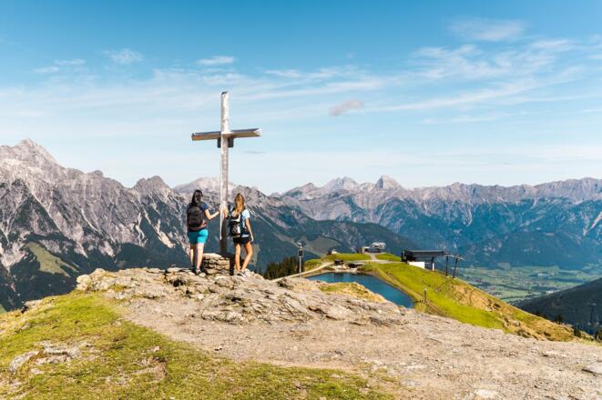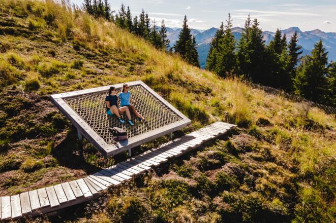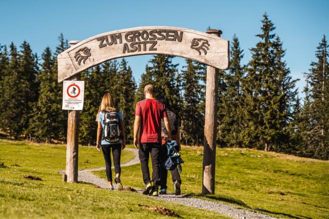 Wer den Berg auf eine besondere Art erleben will, fährt mit Asitz- oder Steinbergbahn bis zur Bergstation und steigt unweit davon in den durch einen Torbogen gekennzeichneten Wanderweg ein. Vorbei an den TONspur Inseln und dem wunderschön gelegenen Speicherteich Asitz II mit Kneippbecken, geht es bis zum ersten Gipfelerlebnis am Großen Asitz auf 1.912m. Weiter entlang des Grates und vorbei an einer weiteren Ruheinsel mit Musik der TONspuren Konzertreihe geht’s weiter zum Sonnkogel wo das Naturkino mit atemberaubender Aussicht wartet. Holzliegen, Sessel, Liegenetze und eine Aussichtsplattform geben genügend Platz für eine Rast mit traumhaftem Panorama. Wer noch nicht genug Eindrücke genossen hat, kann die Wanderung erweitern um den kurzen Anstieg zum Schabergkogel und Geierkogel-Gipfelkreuz oder sogar dem Höhenwanderweg OST der bis nach Saalfelden zum Biberg führt.