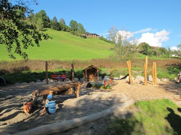 Familienfreundlicher Spazierweg mit Spielplatz entlang eines kleinen Baches