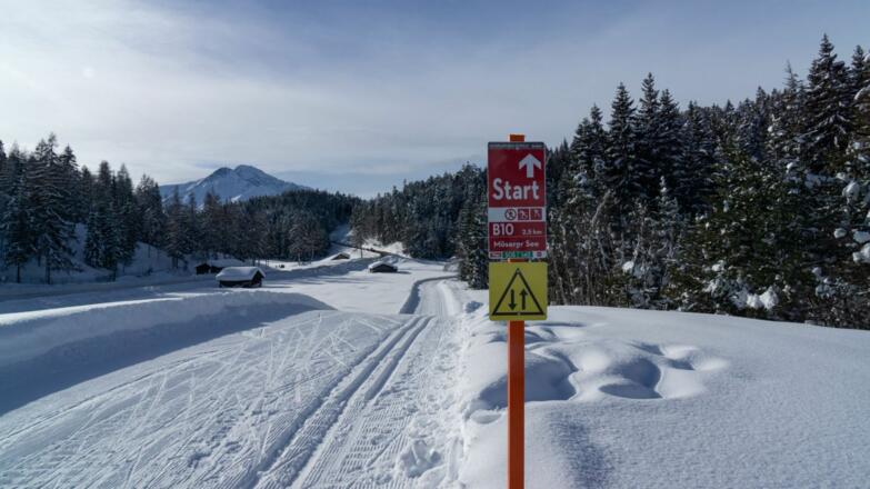 Die B10-Loipe führt mit geringen Steigungsabschnitten durch die Möserer Wälder zum wunderschönen gelegenen Waldsee. Mit knapp zweieinhalb Kilometern Gesamtlänge ist die relativ flache Waldrunde auch bestens für Anfänger*innen geeignet. Mit der Möserer Seestub’n bietet die B10 eine besonders malerische Einkehrmöglichkeit mit gemütlicher Sonnenterrasse direkt am See.