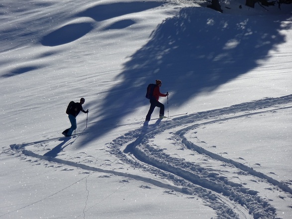 Variante 2: Über die hindernisfreien Hänge ist bei sicheren Verhältnissen eine Abfahrt direkt Richtung Nordosten in den Frommgrund möglich. Sobald man die Forststrasse erreicht, folgt man dieser etwas ins Talinnere und quert dort den Bach, oder man folgt dem Bach etwas talauswärts und quer ihn dort über eine schmale Brücke. Dann dem Tal entlang zurück zum Parkplatz.