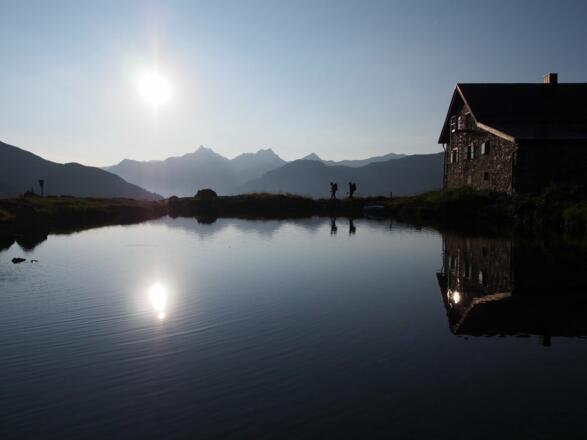 Forstweg Richtung Friedrichshafener Hütte (2.138 m). Dieser führt durch Wald in weiten Kehren bis über die Baumgrenze. Die Schutzhütte liegt malerisch eingebettet an einem kleinen See und bietet einen fantastischen Ausblick auf die Silvretta und das imposante Fluchthorn. Von hier aus geht es zu Fuß Richtung Heilbronner Hütte weiter. Schließlich erreicht man eine Weggabelung, hier folgt man dem Georg-Prasser-Weg in Richtung Schafbichljoch. Der Gipfelanstieg führt am schönen Brüllersee vorbei zur Hohen Köpfe (2.608 m).