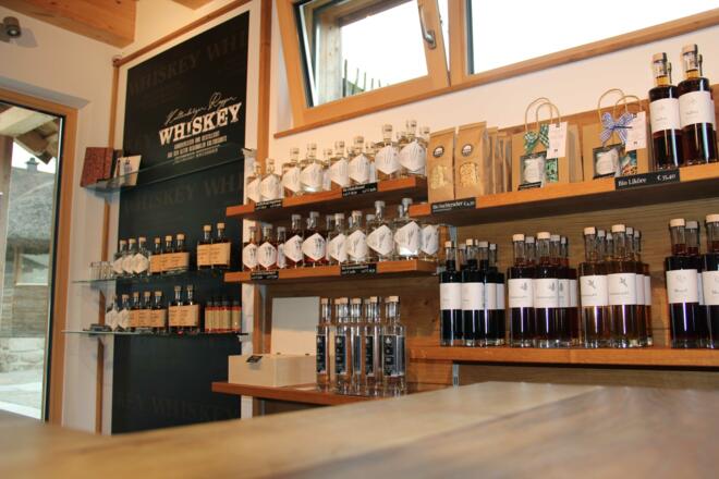 • feine Liköre: hergestellt aus eigenem Qualitätsgetreidebrand und selbstgepflückten Früchten, Beeren, Zapfen, Wipfel und Kräuter.