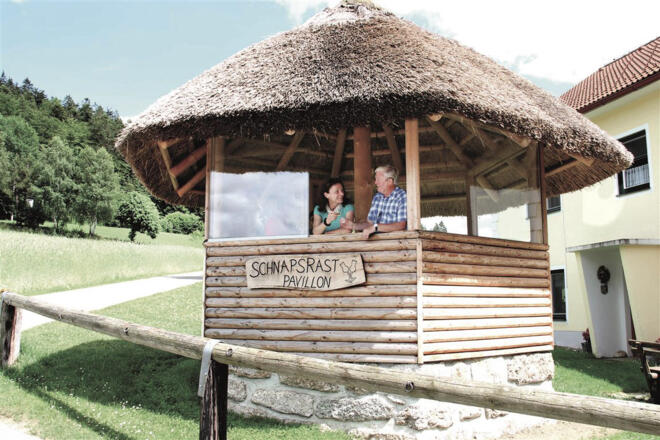 _Schnapsrast-Pavillon: unser strohgedecktes Pavillon lädt zum Verweilen und Genießen bei einer Wanderung, Radtour oder einem Ausritt ein. Ganzjährig geöffnet.