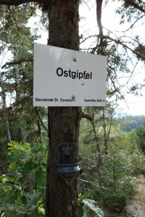 Entlang der Nordwaldkammwegmarkierung vom Parkplatz Braunberghütte nach Osten, vorbei am Schranken (geht auch für Kinderwägen und Rollstühle, sollte der Grundbesitzer Wolfgang Frisch wieder einmal die Tafel zwischen Schranken und nächsten Baum im Norden aufgestellt haben, beim Hüttenwirt Hilfe holen - lässt sich leicht rauszeihen) nach Osten leicht bergan. Der rechte Weg führt direkt bis zur Abzweigung des Gipfelweges vom Nordwaldkammweg, der linke Weg (Rückweg) führt über die Aussicht nach St. Oswald. In wenigen Metern erreicht man den Ostgipfel mit dem 2006 neu erstellten Gipfelkreuz. Mit drei verschiedenen Rollstühlen (Foto) war der Weg machbar bis auf die letzten 80m zum Gipfelkreuz, von dort ist der Gipfel schon zu sehen.