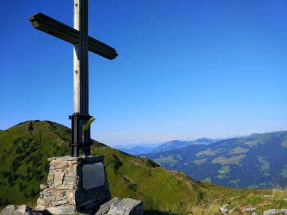 Der Blick vom Gipfel richtet sich direkt auf den Großen Beil, das weite Tal der Wildschönau und auf der anderen Seite auf die hinteren Berge der Kelchsau und die Berge der Kitzbühler Alpen.