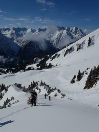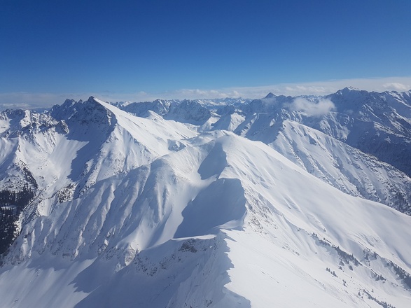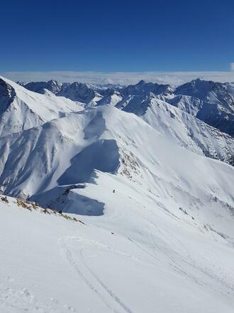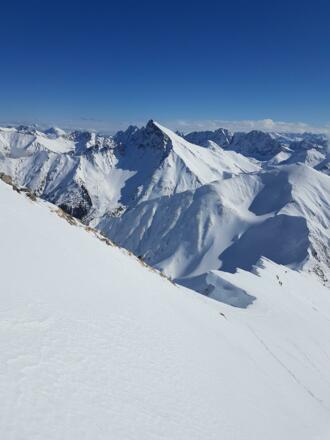 Griabiger Frühjahrsklassiker im Lechtal. Auf dem Weg zum Hahntennjoch bei Bschlabs weg, geht's über die Bortigscharte hoch zur Bschlaber Kreuzspitz 2462m. Der Lechtaler Grasberg ist meist (stark) überwechtet und wartet oftmals mit großen Gleischneemäulern auf.
