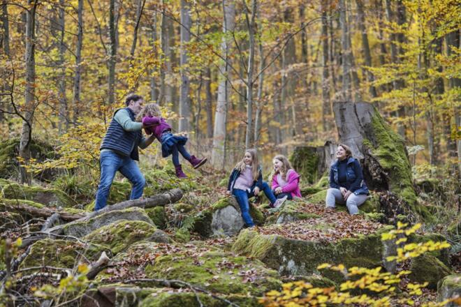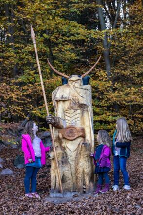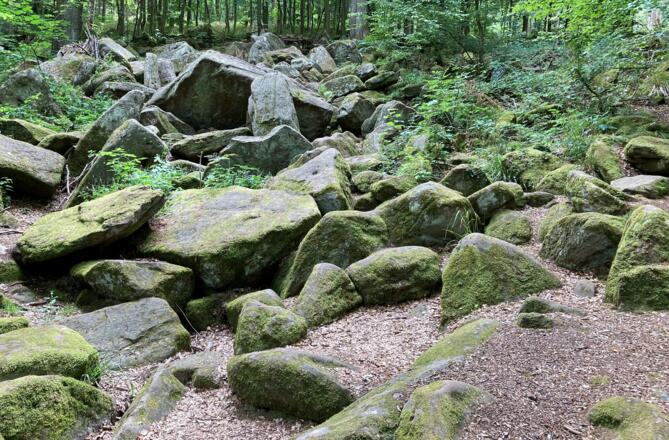 Wenn wir vom Bismarckweg aus, den Aussichtspunkt mit den Kunstwerken von Odin und Frigga sowie einer Ruhebank erreicht haben, gehen wir geradeaus auf dem Fahrweg und „3 im Wald“-Rundweg zum Ottostein weiter. Von dort aus steigen wir durch das spektakuläre Naturdenkmal „Felsenmeer“ zur Klingenbrücke ab.