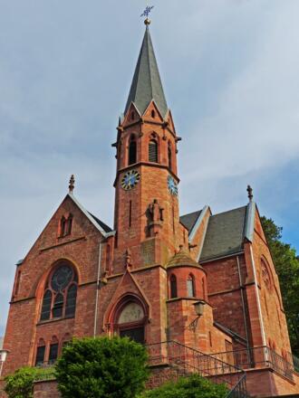 Im Burgweg wenden wir uns aber nach links in Richtung der aus rotem Sandstein in neugotischem Stil errichteten Evangelischen Johanneskirche und gehen vorbei an dem unterhalb liegenden, alten jüdischen Friedhof. Im Stadtpark mit seinen über 150 verschiedenen Baum- und Straucharten lugt rechterhand die prächtige Sandsteinfassade der ehemaligen „Villa Jakob“ durch die Bäume. Nach der Evangelischen Johanneskirche führt eine Pflasterstraße hinunter in die Stadt zum „Engelplatz“, den die Fassade des Rathauses beherrscht. Schon beim Weg hinunter wird der Blick vom Turm der Mainbrücke mit dem vorgelagerten Treppenbauwerk angezogen.