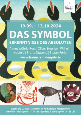 Unter einem Symbol versteht man in der bildenden Kunst ein Sinnbild, das auf einen tieferen, bedeutsamen Inhalt verweist. Symbolträger können geometrische Zeichen, Tiere, Pflanzen, Farben und vieles mehr sein. Die Ausstellung vereint Bildwerke von fünf verschiedenen Künstlern, die aus unterschiedlichen Generationen stammen. Zu sehen sind Holzschnitte des bedeutenden Buchkünstlers Wilhelm Neufeld (1908-1995) und Malerei von Bruno Tausend (1915-1984) sowie Beispiele aus der Serie „Icons“ der Künstlerin Almut Wöhrle-Russ (* 1950) und Malerei von Oliver Stephan (*1971). Die Bronzeskulpturen von Stefan Forler (*1940) runden die Schau ab. Behandelt wird die Symbolik existentieller Menschheitsthemen wie die Liebe und der Tod, die Natur und die Schöpfung oder auch die Verwobenheit des Individuums mit seiner Umwelt.