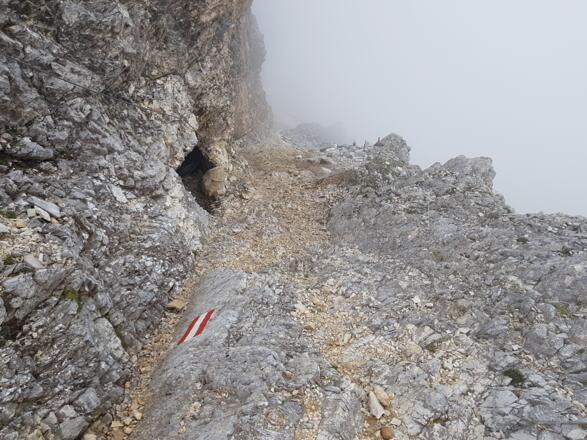 Keine Ausstiegsmöglichkeiten entlang des Klettersteiges! Daher sollte die Tour nur bei stabilem Wetter in Angriff genommen werden. Im Mittelteil gibt es ein weisses Statikseil, welches zu einem Biwackplatz unter einem Felsen führt. Bei drohendem Gewitter ist es die einzige Stelle die Schutz bietet.