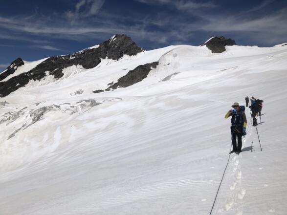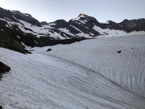 Eine weitere Schlüsselstelle war für uns eine große Wächte im Abstieg Richtung Umballkees auf 3320m (Stand am 07.07.21). Die Wächte bedroht den gesamten Aufstieg vom Umballkees hinauf zur Scharte vor dem Gipfel.