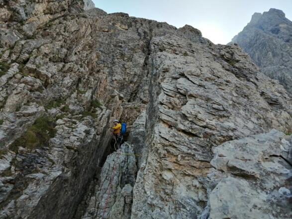 Anschließend in drei homogenen und plattigen Seillängen bis III über die Nordwestrampe auf den aussichtsreichen Prestigegipfel des Roten Turm (2702m)