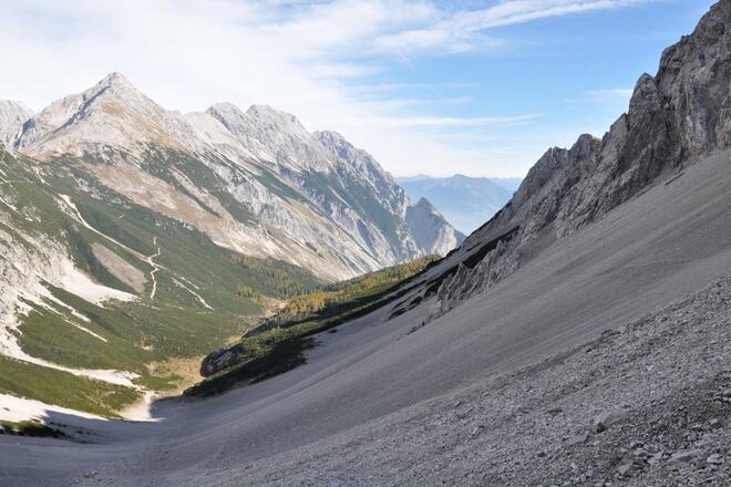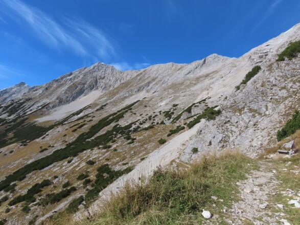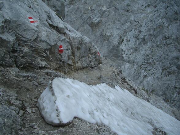 Ab hier führt der Steig nun steil über eine Schotterreise hinab. ACHTUNG: Im Frühsommer liegt in der Stempelreise zum Teil sehr viel Altschnee, der am frühen Morgen sehr hart gefroren ist (hierfür Stecken und Grödel mitnehmen)!
