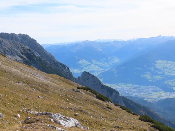 Nach etwa 140 hm Abstieg zweigt man linker Hand in den Wilde-Bande-Steig ein. Auch auf diesem Übergang liegen häufig Altschneefelder. Zunächst geht es unter den Ost- und Südflanken der Stempeljochspitzen, des Roßkopfes sowie des Großen und Kleinen Lafatschers annähernd Höhenlinienparallel in leichtem Auf und Ab Richtung Lafatscher Joch. Vor dem Lafatscher Joch (2081 m) steigt man noch einmal etwa 80 hm hinauf. Ab hier verläuft der Steig 222 (= Via Alpina) leicht ansteigend Richtung Osten durch das Kleine und Große Speckkar. Die letzten Meter zur Bettelwurfhütte legt man zurück, während man die weitreichenden Blicke ins Halltal und ins Inntal genießt.
