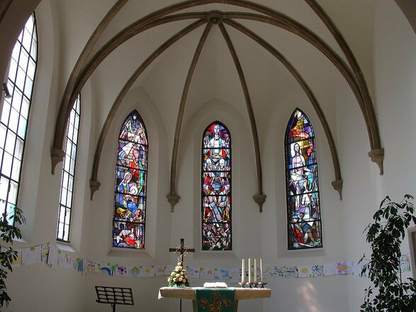 1862/63 Errichtung der Kirche im neugotischen Stil. Erweiterungen 1908/09 und 1961/62. Im Inneren des modernen Kirchenbaus wird der Blick zum neugotischen Chor mit den drei Glasfenstern gelenkt, die