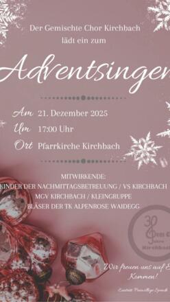 Mitwirkende: Gemischter Chor Kirchbach, Kinder der Nachmittagsbetreuung/Volksschule Kirchbach, MGV Kirchbach/Kleingruppe, Bläser der Trachtenkapelle Alpenrose Waidegg