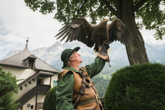 Falknerei Sonderprogramm mit historischer Hof-und Jagdmusik.
