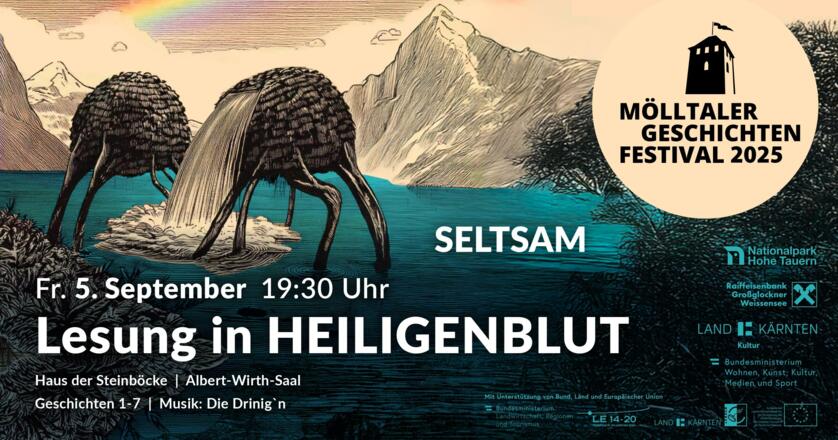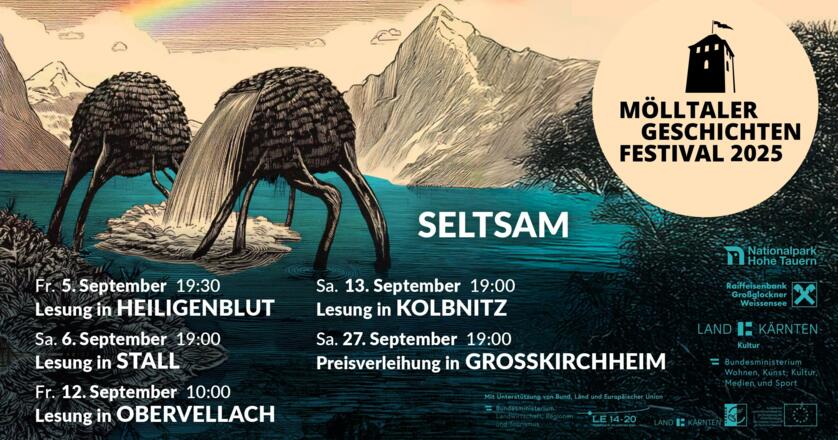 Das Oberkärntner Literaturfestival präsentiert die ersten 7 von 21 ausgewählten Geschichten seines internationalen Wettbewerbs zum Thema „seltsam“. Bei dieser ersten Lesung stellen sich die Autoren & Autorinnen der Publikumsjury im Albert-Wirth-Saal im Steinbockhaus, Heiligenblut. Eintritt gratis (Spenden erhofft). Genauere Informationen unter www.moelltaler-geschichten-festival.at