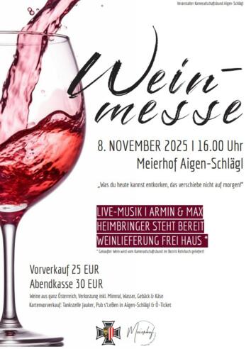 „Was du heute kannst entkorken, das verschiebe nicht auf morgen!“Der Kameradschaftsbund Aigen-Schlägl lädt recht herzlich zur Weinmesse im Meierhof Aigen-Schlägl ein.