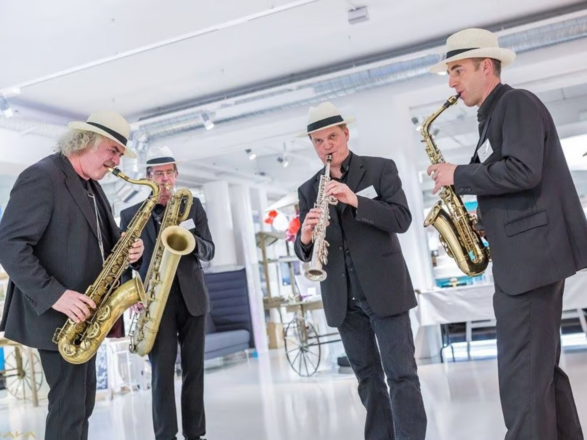 Die Musiker von Sax Frontal, einem mobilen Saxophonquartett für jeden Anlass, bedienen sich sämtlicher Musikstile wie Jazz, Dixie, Schlager der 20er bis 70er Jahre, aber auch Volksmusik und Klassik. Gespielt wird unverstärkt, ohne Noten und frei improvisiert.