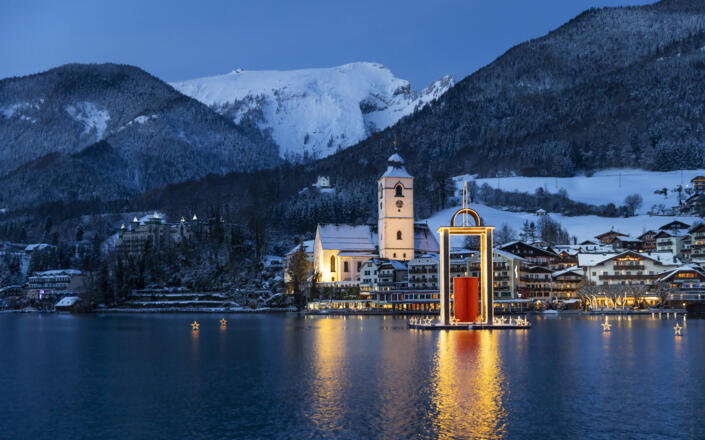 Das Wahrzeichen des Wolfgangseer Advent, die schwimmende Adventlaterne ist mit 16 Meter Höhe das höchste Bauwerk im Wolfgangsee. Insgesamt sind an der Laterne 0,5 Kilometer Leuchtschlangen (LED) verbaut.