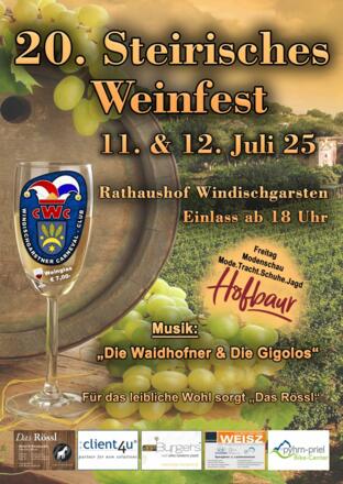 Beste Weine, Kulinarik, Live-Musik, bietet das „Steirische Weinfest“ des WCC (Windischgarstner- Carneval-Clubs) mit Weinbauern aus der Süd-und Oststeiermark am 11. und 12. Juli, Beginn jeweils 18:00 Uhr im Rathaushof. In diesem Jahr findet Am Freitag wieder die beliebte Modenschau statt.
