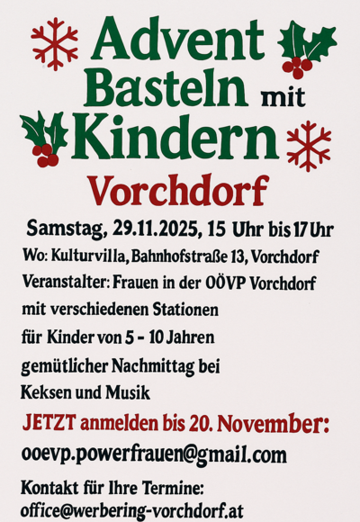Lass Dich am Samstag ab 14:00 Uhr und am Sonntag ab 10:30 Uhr am Marktplatz bzw. im Pfarrheim in Vorchdorf auf den Advent einstimmen!