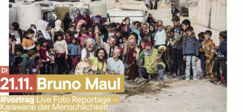 In der neuen Live-Foto-Reportage "Karawane der Menschlichkeit" geben die Reisefotografen Bruno Maul und Pascal Violo erstmals Einblicke in ihre ehrenamtliche Arbeite als Helfer in unterschiedlichen Flüchtlingscamps an den Rändern von Europa. Der Vortrag ist eine Benefiz-Veranstaltung. Einlass ab 19 Uhr.