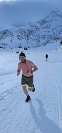 Die Teilnehmer*innen wagen sich bei Minustemperaturen nur leicht bekleidet auf Langlaufskiern durch die Winterlandschaft, bevor sie sich in ein Eisbad begeben.