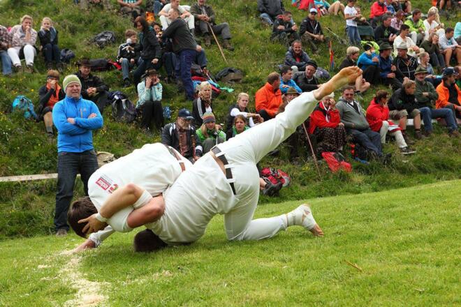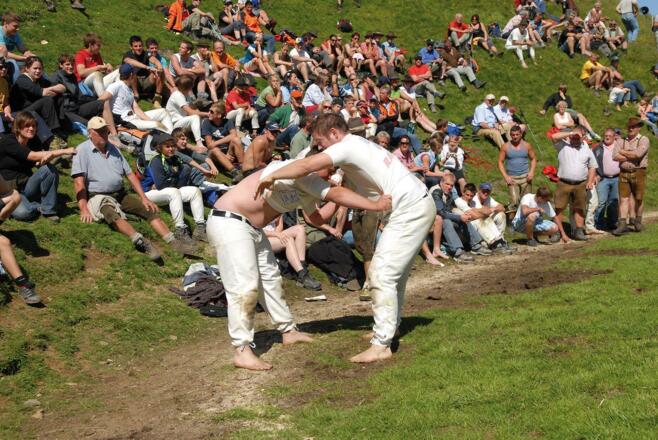 Ranggeln ist eine der ältesten Sportarten in den Alpen – und richtig spannend! Zwei Gegner messen sich mit Kraft, Technik und Geschick, um den anderen auf den Rücken zu bringen. Wer beide Schultern auf den Boden legt, gewinnt den Kampf.