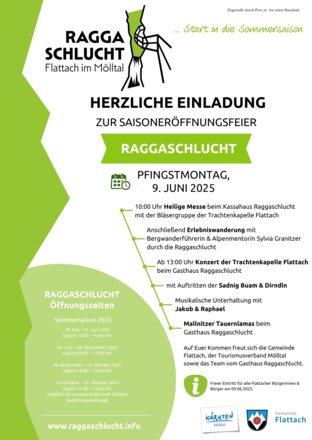 Auf Euer Kommen freut sich die Gemeinde Flattach, der Tourismusverband Mölltal sowie das Team vom Gasthaus Raggaschlucht.