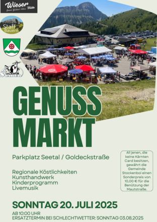 Am 20. Juli ab 10.00 Uhr laden die Staffbauern herzlich zum Genussmarkt im Goldeck Seetal ein – Regionale Köstlichkeiten, Kunsthandwerk, Streichelzoo und Livemusik erwarten euch an diesem Tag.
