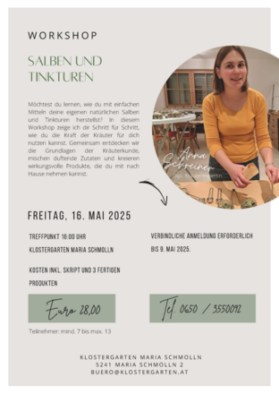 Möchtest du lernen, wie du mit einfachen Mitteln deine eigenen natürliche Salben und Tinkturen herstellst? In diesem Workshop zeige ich dir Schritt für Schritt wie du die Kraft der Kräuter für dich nutzen kannst. Gemeinsam entdecken wir die Grundlagen der Kräuterkunde, mischen duftende Zutaten und kreieren wirkungsvolle Produkte, die du mit nach Hause nehmen kannst.