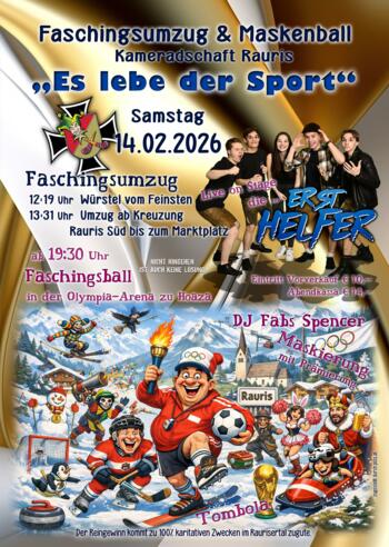 ab 19:30 Uhr Maskenball "Es lebe der Sport" in der Olympia Arena zu Hoaza, Live on Stage die "Erst Helfer", Maskierung mit Prämierung, Tombola, Eintritt VVK € 10,-, Abendkassa € 14,-