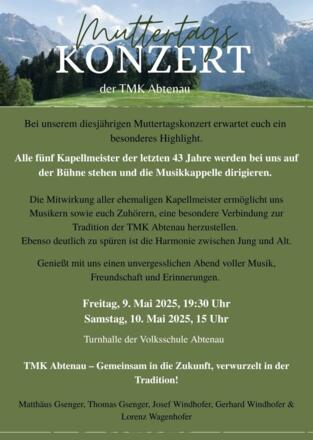 Die Trachtenmusikkapelle Abtenau lädt heuer gleich zweimal zum traditionellen Muttertagskonzert in die Turnhalle der Volksschule Abtenau ein.