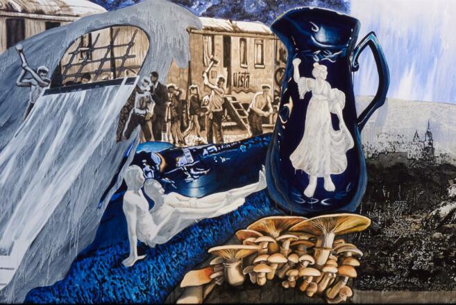 Im Zentrum der künstlerischen Praxis von Mikołaj Sobczak steht die Darstellung alternativer historischer Narrative; in seine Gemälde und Assemblagen fügt er Protagonist:innen aus queeren und gegenkulturellen Emanzipationsbewegungen ein.