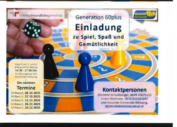 Informationen unter: https://www.adlwang.at/Generation_60plus_Spielenachmittag oder per E-Mail: gemeinde@adlwang.ooe.gv.at