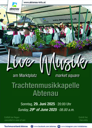Ein Blasmusik Platzkonzert der "Trachtenmusikkapelle Abtenau".Kostenlos - entfällt nur bei Regen!