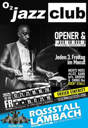 O2-JAZZ-CLUB & JAM-SESSION. O2-Jazz-Club & Jam-Session mit dem O2-OPENER. Nach dem Opener ist die O2-Jam-Session angesagt. Einladung an alle Urgesteine, Talente, Legenden, JUNG/ALT-MUSIKER auf die Bühne zu gehen oder als BesucherIn zu lauschen - let's swing & groove im O2 ROSSSTALL LAMBACH. Vorbeikommen und die Rhythmen & Schwingungen spüren. O2-Jam-Session - NICHTS MUSS, ALLES KANN, O2 stellt die Rossstall-Bühne für die Musiker zur Verfügung. Bei Interesse als Opener-Band, einfach bei O2 ROSSSTALL LAMBACH per Mail melden. Sollten Session-MusikerInnen bereits im Vorfeld angekündigt werden wollen (Internet, Medien ...) bzw. bereits planen, bei O2 aufzutreten, einfach bei O2 melden, ansonst einfach spontan mitspielen. www.gruppeo2.at.